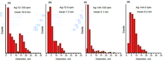 Size distribution for the samples (a) Ag-72-150 rpm, (b) Ag-72-0 rpm, (c) Ag-144-150 rpm and (d) Ag-144-0 rpm.