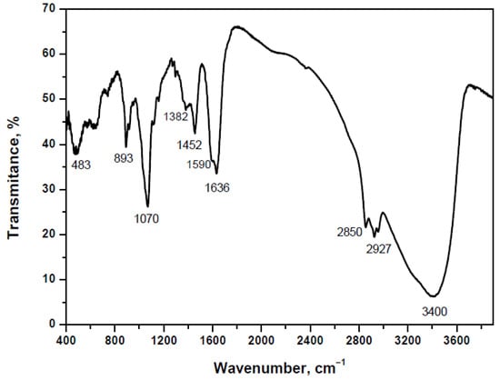 In the FTIR spectrum of the AgNPs, shown in Figure 11, stretching vibrations for the deprotonated carboxyl group (νCOO−) are observed at 1590 and 1382 cm−1. Furthermore, the broad band centered at 3400 cm−1 is assigned to the stretching vibrations of –N–H and –O–H bonds; the strong bands at 1636 and 1070 cm−1 are due to a carbonyl group (νC=O) in amide and a C–O single bond (νC–O); and the weak bands at 2927, 2850 and 1452 cm−1 arise from asymmetric and symmetric stretch vibrations and the deformation vibrations of C–H bonds from CH3 and CH2 groups []. Thus, it was suggested that the deprotonated proteins wrap the AgNPs to improve their stability and dispersion in aqueous solutions [,]. In our previous work, the –COOH, –NH2 and –OH functional groups in the proteins of cell-free extract were also proven by FTIR [].