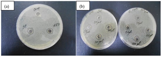 Inhibition zones of the AgNPs obtained by biotransformation under static and dynamic conditions, with respect to E. coli strain 3398: (a) 50 μL suspension of Ag-144-0 rpm (on the left) and Ag-144-150 rpm (on the right) with distilled water used as control; (b) 25, 50, 75 and 100 μL suspension of Ag-144-0 rpm (in the left Petri dish) and Ag-144-150 rpm (in the right Petri dish).