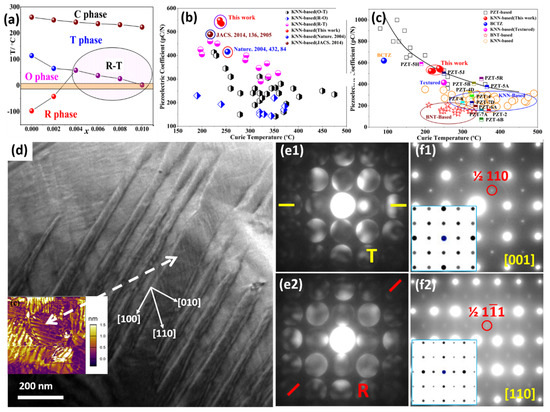 Piezoelectric property optimization via constructing the polymorphic R-T phase boundary in KNN-based materials: (a) phase diagram of KNN-based materials with respect to the fraction of BiFeO3. (b,c) comparison of piezoelectricity as a function of TC of the KNNS-xBF-yBNZ and other lead-based and lead-free piezoceramics. Hierarchical nanodomain structure of KNN-based piezoelectrics: (d) TEM image showing structures with hierarchical nanodomain, with a PFM photo inset. (e1,e2) CBED patterns of adjacent nanodomains, showing mirror planes along {010} and {100} for R phase and T phases, respectively. (f1,f2) Electron diffraction patterns showing superlattices, with simulated patterns inset. Reproduced from: Ref. [44] Copyright 2016 American Chemical Society; Ref. [114] Copyright 2017 Royal Society of Chemistry.