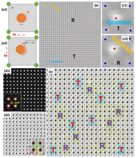 STEM HAADF was employed to identify the coordinates of a perovskite ABO3 lattice (A for K/Na and its substitutions while B for Nb and its substitutions) precisely, and to locate the local symmetry via the displacement vector of atom B. Figure 2b is a STEM HAADF lattice image gained on a domain boundary. Thanks to the Z-contrast difference, the A and B sites of the perovskite ABO3 lattice could be clearly recognized. A peak finder strategy was applied to identify the coordinates of atom columns precisely [43,44,133,134,135], as shown in Figure 2b. Figure 2(c1,c2) show enlarged versions from Figure 2b, indicating that the displacement vectors of the centers relative to the corners are variable, some are arranged along <100> while others on <110>, and they are in keeping with the schematics of the T and R unit cells seen in Figure 2(a1,a2). The local symmetry inside the nanodomains is a reflection of the T and R coexistence phases.