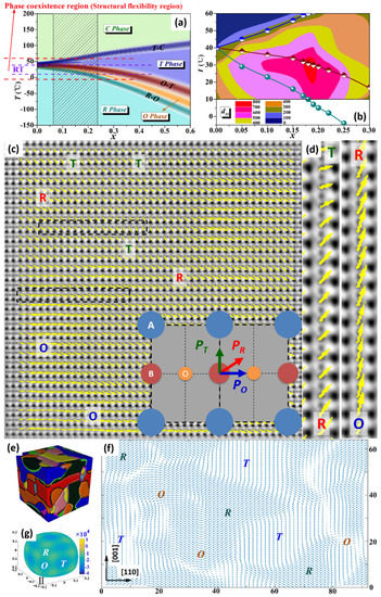 According to the atomic polarization mappings and theoretical calculations, the physical origin of good piezoelectric properties at the phase transition region is the phase coexistence (T+O+R) inside hierarchical nanodomains, and the gradual polarization rotation is a bridge between different phases. This static polarization state may simulate dynamic polarization changes under external stimuli (heat or electric field). This kind of origin is common in piezoelectric materials with phase boundary components [44,114,115,128,129]. It is extremely important to understand the roles of such atomic-scale coexisted phases and the gradual polarization rotation between them on high piezoelectricity at phase boundaries, which is the base for further designing new materials with higher performance.