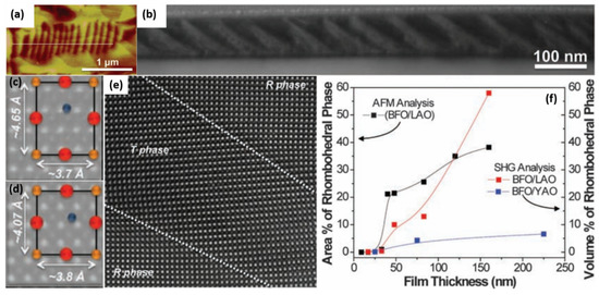 The other promising lead-free piezoelectric materials are BiFeO3-based, presenting much higher TC (~500 °C), compared with KNN and BaTiO3 [137], however it is challenging to achieve good ferroelectric/piezoelectric properties of BFO, because of its high leakage current. High quality BFO thin films have been recently achieved through strain engineering [138,139,140,141,142]. They are promising for high-density memory and spintronic devices. One of the characteristic achievements in BFO thin films was to construct a strain-driven phase boundary [141], which completely differs from the traditional chemical approaches. Zeches et al. demonstrated how to employ epitaxial strain to drive the formation of a phase coexisted boundary and thus produce a giant piezoelectric response in lead-free ferroelectric thin films. The phase coexistence of the tetragonal (T) nanoscale phase within the parent R-phase matrix is beneficial for the ferroelectric/piezoelectric performance. Both atomic force microscope (AFM) and TEM images show strip nanodomains which might be attributed to the coexisted phases, as shown in Figure 4a,b. The phase coexistence was directly seen via aberration-corrected STEM. The atomically-resolved STEM HAADF image in Figure 4c–e clearly differentiated the local R and T phases. Figure 4f gives the relative fractions of these two coexisting phases with respect to the film thickness. The phase coexistence could happen when the film thickness >50 nm. Moreover, the substrates with different lattice mismatches show different local structures in BFO film. The aberration-corrected STEM observation can support the assumption of a strain-driven phase boundary in thin film.