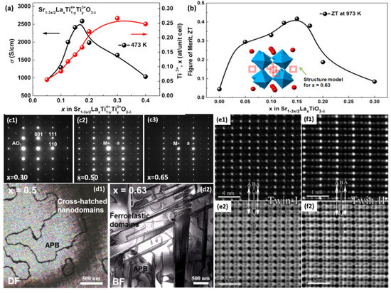 SrTiO3-based thermoelectric oxides have attracted considerable attention due to their thermally stable features, compared with conventional semiconductor-based thermoelectric materials. With donor-doping with a higher valence ion on the Sr site, like La-doped SrTiO3, the overall thermoelectric performance of SrTiO3 has been improved remarkably, making this material system promising for high-temperature usage [146,147,148,149]. To compensate for the extra positive charge from the substitution of Sr2+ by La3+, A-site vacancies might form according to the general formula Sr1−3x/2LaxTiO3. Lu et al. investigated the structure and thermoelectric properties of Sr1−3x/2LaxTiO3 ceramics with different content of La dopants. It as shown that the thermoelectric properties, especially the electrical transport, are highly sensitive to the content of La, as shown in Figure 5a,b. Advanced electron microscopies, including aberration-corrected STEM, were employed to reveal the structural origin of this phenomenon. The samples with 0.10 ≤ x < 0.30 presented as overall cubic structure with superstructure (Figure 5(c1)); the samples with 0.30 ≤ x < 0.50 exhibited additional short-range A-site vacancy ordering (Figure 5(c2)); and the samples with x ≥ 0.50 were orthorhombic with a tilt system and long-range vacancy ordering (Figure 5(c3)). TEM images of Sr1−3x/2LaxTiO3 with x = 0.50 along <110> revealed antiphase boundaries associated with antiphase rotations of the O-octahedra. For the sample with x = 0.63, it showed ferroelastic domains with orthorhombic distortion. The key feature of vacancy ordering can be directly seen via aberration-corrected STEM. As shown in Figure 5(e1,e2,f1,f2), two types of domains with normal perovskite and layered structures exist. The layered structure was formed due to cation vacancy ordering.