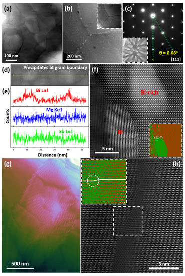 Submicron grains come from the spark plasma sintering method [151] or the hot-pressing sintering method [163], an indispensable synthesis strategy in thermoelectrics because the mechanical properties of pristine ingot are usually too weak to be used [151,163]. The grain size could be even lowered into nanoscale by solvothermal method combined with spark plasma sintering [164]. Submicron and nanoscale grains produce dense low-angle grain boundaries with arrays of atomic-scale dislocations that serve as significant phonon scattering centers [14], in particular, for phonons with long waves [151,163]. Under some circumstances, the segregation of the precipitated phase occurs at grain boundaries. As shown in Figure 6d–f, at the grain boundary, there are high density nano-meter precipitates segregated at triple junctions. The HRSTEM HAADF image in Figure 6f concentrates on a Bi precipitate at the grain boundary as well as on a Bi-rich precipitate inside the grain. Its strain analysis through geometric phase analysis (GPA) indicates that high strain centers are arranged between the Bi precipitates and the matrix, corresponding to the interface dislocation core. In addition, Bi nanoprecipitates can not only release the strain between the mismatched grains, but can also further promote charge redistribution as additional carriers, which are parallel to the result of modulated doping [21,22,165,166].
