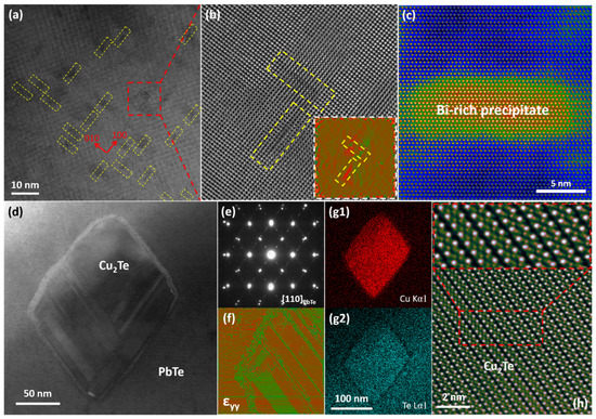 Nanocrystalline precipitation is a characteristic feature of thermoelectric materials with nano-structures. For example, Okhay et al. contributed a good review about impact of graphene or reduced graphene oxide on performance of thermoelectric composites, including chalcogenides, skutterudites, and metal oxides [170,171]. Nanostructures have been the main structural defects for scattering phonons with short to middle wavelengths, which depends on the size and morphology of precipitation. Regular shapes were found that layer Pb, Bi poor phase in a SnTe system [172], and the rod-like Bi rich phase in a Mg3Sb2 system [167], as shown in Figure 7c. The lattice of a precipitate is very similar to that of the matrix, and there is no lattice mismatch, so the GPA strain analysis indicates a homogenous strain distribution. Nanoprecipitates with atomic-scale coherent interfaces can scatter phonons efficiently without causing too much disturbance to carrier transport. As shown in Figure 7e,f,(g1,g2), the Cu2Te precipitate which was identified by the EDS method was well-faceted. The electron diffraction patterns show centrosymmetric peak splitting, which reflects the epitaxial orientation relation between the layered Cu2Te (space group: P6/mmm) and cubic PbTe structures, as shown in Figure 7e. These phase boundaries can effectively scatter phonons without influencing carrier transport due to small lattice mismatch between two phases. The strain distribution around the Cu2Te precipitated phase was obtained by GPA [89]. According to the strain analysis in Figure 7f, the phase boundary has dislocation cores, and the layered Cu2Te precipitated phase presents periodical strain distribution. Figure 7h shows STEM HAADF/ABF lattice images of the Cu2Te precipitated phase with a four-layer structure. The insert shows the enlarged image around the superimposed fault, and high strain can be observed in Figure 7f. These structural defects may provide additional phonon scattering sources.