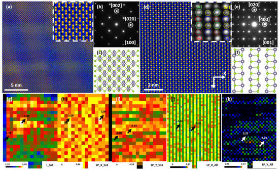 In addition to vacancies and interstitials, another important type of point defects, substitutions, could also been utilized to optimize the electrical and thermal transport. In thermoelectrics, the well-employed band structure engineering strategies to boost the Seebeck coefficient, e.g., band alignment and band gap enlargement, are highly related with substitutions, like Sr doped in PbTe [151,152], Mg doped in PbTe [13], and Se doped in PbTe [10]. For SnSe, Te alloying as a substitution could increase the crystal symmetry, optimize the bond structure, change the band shape, and thus enhance the electrical transport properties. Meanwhile, the substitutions could play as phonon scattering centers and contribute to lower the thermal conductivity [33]. AC-STEM revealed the substitution of Te dopants at Se sites and its effluence at atom bonds. Figure 9a is an atomic resolution STEM HAADF image along {100} region axis (a axis), showing a dumbbell-shaped arrangement of atoms. Each atom column is not round, but rather slightly elongated and mismatched because half of the Sn and Se atoms overlapped. The two columns of the dumbbell were actually of equal intensity. To better view the substitution of Te on Se or Na on Sn sites, it turns to the b or c axis, because the Sn and Se columns could be nicely separated along these axes. Figure 9d is an atomically resolved STEM HAADF image along {001} region axis (c axis). It is clear that Sn and Se atoms are well distinguished by their apparent intensity differences. The respective electron diffraction patterns in Figure 9e show the reflection of the superlattice due to multiple cycles in arrangement of the atoms, as opposed to the case along the a axis (Figure 9b).