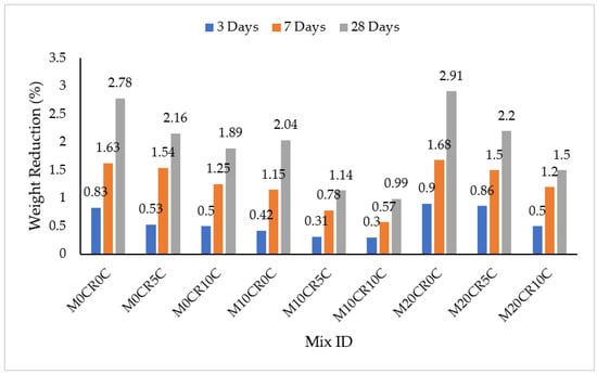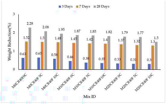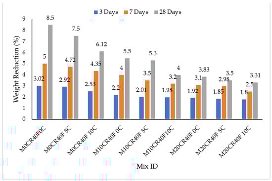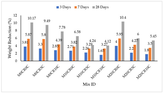 The effect of acid attack on SCC mixes was measured by immersion in H2SO4 concentration and the results are presented in Figure 2 and Figure 3. It can clearly be seen that sulphate decreased the weight of all the SCC mixes, as presented in Figure 2 and Figure 3. The decrease in weight (%) can be attributed to the large amount of CaO in the CCW and Portland cement and its hydration product Ca(OH)2, which is primarily responsible for the poor resistance of SCC exposed to acidic attack [37]. The weights of all of the SCC mixes were reduced with the increasing of the immersion period in H2SO4. This was a result of continuous attack by the sulphate over time. However, the attack by sulphate was reduced for mixes containing fly ash, as shown in Figure 3. At 28-day immersion age, the M10CR10C mix had the greatest resistance to acid attack for the mixes not containing fly ash, while the M20CR40F10C mix had the greatest resistance to acid attacks for mixes with fly ash, with a 16% reduction in acid penetration upon incorporation of HVFA to the mix. On the other hand, the M20CR0C mix had the least resistance to acid attack for mixes containing no fly ash, while the M0CR40F0C mix had the least resistance to acid attack for mixes with a 40% replacement of cement with fly ash, showing a 23% reduction in acid penetration upon incorporation of fly ash to the mix.