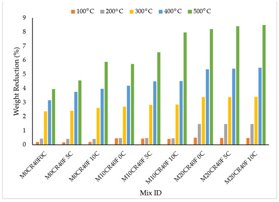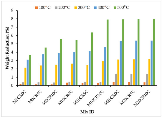 Figure 6 and Figure 7 shows the percentage weight reduction in the SCC mixes at varied temperatures. These figures show that the SCC blends lost more of their weight as the CR content was increased. This observation was noticed as the temperature increased, as shown in the aforementioned figures. The reduction in weight could be a result of spalling caused by internal water pressure at about 300 °C and during the dehydration of hydrated calcium silicate hydrate, which is known to increase internal stresses and induces micro-cracks [44]. The decrease in weight could also have resulted from the expulsion of the excess pore water in the SCC mix [45]. Generally, the addition of 40% optimum fly ash yielded a further decrease in the weight of the mixes by 6%, when compared with the mix without fly ash (M20CR10C) at 500 °C and the M20CR40F10C mix for mixes with fly ash. This confirms a similar result obtained by Fawzy et al. [46] after heating at 200 °C and below.