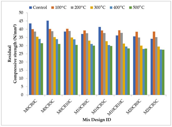 The compressive strengths of the various replacements when subjected to elevated temperatures of 100, 200, 300, 400, and 500 °C are graphically represented in Figure 9 and Figure 10. The compressive strength of SCC mixes was decreased with the increase in the temperature. A slight increase in the compressive strength was observed for all mixes and their replicas containing fly ash at control temperature (27 °C) except for the M10CR0C, M10CR0C, M10CR10C, M20CR0C, and M20CR5C mixes, which experienced increases in compressive strength at 100 °C before a further decrease. This was due to the reduction in the calcium hydroxide and un-hydrated area fraction aided by autoclaving (heat healing effect), which enhanced the microstructure [47]. The highest loss in compressive strength was observed at the temperature between 300 and 400 °C due to the calcium silicate hydrate (C-S-H). The incorporation of CR to the mix also reduced the rate of compressive strength loss because the melted rubber particle at 200 °C left space for water vapor to escape and, thus, helped to release the pore pressure. This outcome is similar to the findings of Huang et al. [48]. Generally, it can be observed that CCW slightly increased the compressive strength up to 200 °C and then decreased it after that. This increase was a result of the reaction of CCW with the free lime to produce more CSH and CAH, which deposited in the pore system, and also occurred because of the higher volume of CSH and CAH phases formed and the reduction in Ca(OH)2 content.