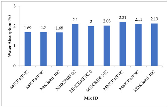 Figure 11 and Figure 12 show the water absorption capacity of the various SCC mixes. The water absorption of the SCC mixes increased with the increment in the partial replacement of fine aggregate with CR for the mixes with and without fly ash. For mixes without fly ash, the water absorption of mixes M10CR0C and M20R0C was higher, by 36.21% and 62.64%, respectively, compared to mix M0CR0C (control mix). Similarly, for mixes with fly ash, the water absorption of mixes M10CR40F0C and M20CR40F0C was lower, by 24.26% and 30.77%, respectively, compared to mix M0CR40F0C. The reduction in water absorption due to CR incorporation can be attributed to the hydrophobic nature of CR, causing it to entrap air on its surface during mixing. When the concrete dried up, the entrapped air left excess voids in the cement matrix, thereby increasing porosity and, hence, leading to higher water absorption [7,8]. The addition of CCW slightly increased the water absorption of mixes without fly ash. For instance, the water absorption of mix M0CR5C was slightly higher than that of the control (by 1.15%), while mix M0CR10C had the same water absorption value as the control mix (M0CR0C). Furthermore, the addition of CCW partially mitigated the negative effect of CR on the water absorption of the SCC mixes with or without fly ash. This can be observed by comparing the water absorption value of M20CR0C (2.83%) with that of M20CR5C (2.19%) and M20CR10C (2.15%), and that of mix M20CR40F0C (2.21%) with M20CR40F5C (2.11%) and M20CR40F10C (2.13%). The reduction in water absorption due to the addition of CCW can be attributed to its finer sizes, thereby acting as a filler material and filling the pores created by the CR and, hence, reducing the water absorption. Another reason could be the higher reactivity of CCW, thereby allowing it to react with cement hydration products to form more C-S-H gels, which filled the nanopores in the cement matrix and, hence, reduced the water absorption [4,6]. By comparing Figure 11 with Figure 12, it can be seen that for the SCC with fly ash, mixes with same amount of CR and CCW had lower water absorption values compared to the SCC mixes without fly ash with the same amount CR and CCW. This was due to the pozzolanic reaction between the SiO2 from fly ash and Ca(OH)2 from CCW to generate excess C-S-H gels, which filled up the pores in the cement matrix and the decreased water content, similarly to the in the SCC without fly ash. Therefore, it can be concluded that the incorporation of CCW and fly ash reduces the water absorption due to the refined pore system created by fly ash and the CCW microstructure. Overall, the water absorption of the SCC blends containing the replacements in the right proportion resulted in a more durable SCC. This is in line with the research conducted by Mohammed and Adamu [8].