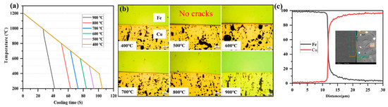 Figure 1 is a schematic diagram of the steel–copper bimetal two-stage cooling device. After the solid–liquid forming, the bimetal is placed in the position of the red solid line in Figure 1a for forced air cooling. The copper liquid cooling temperature is monitored by a temperature sensor: when the solidification temperature reaches the preset temperature (400–900 °C), the bimetal sample is lowered to the position of the red dotted line, as through cooling the oil rapidly solidification occurs to obtain bimetal samples.