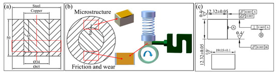 Bimetal samples size and sampling method. (a) Bimetal size before sampling; (b) microstructure and friction sampling location; and (c) size of the samples.