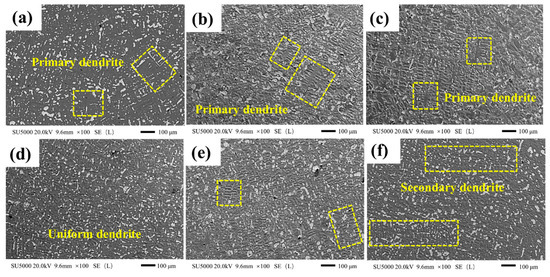 Copper layers dendrite morphology at different solidification temperatures. (a) 400 °C, (b) 500 °C, (c) 600 °C, (d) 700 °C, (e) 800 °C, and (f) 900 °C.