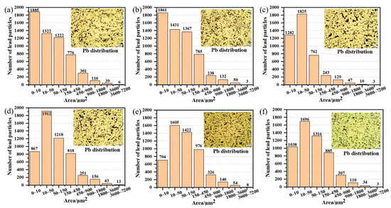 The copper layer Pb statistics. (a) 400 °C, (b) 500 °C, (c) 600 °C, (d) 700 °C, (e) 800 °C, and (f) 900 °C.