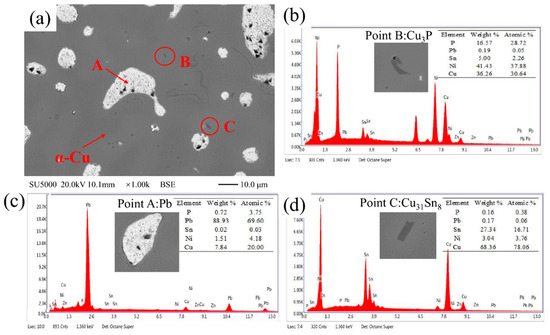 Figure 7 shows the EDS point scan of each phase in the copper layer. The structure mainly was α-Cu, δ (Cu31Sn8), Cu3P, and Pb phases. The α-Cu matrix is soft, and δ and Cu3P are both hard phases, which can increase the surface hardness of the alloy and improve the wear resistance.