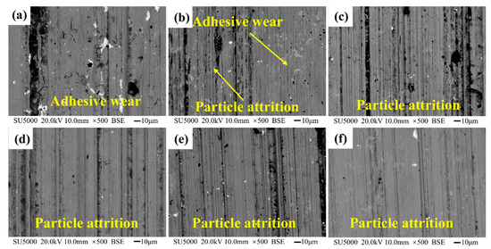 The copper layer wear scar morphology. (a) 400 °C, (b) 500 °C, (c) 600 °C, (d) 700 °C, (e) 800 °C, and (f) 900 °C.