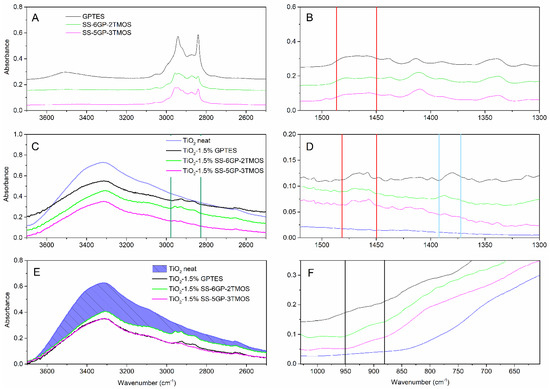 FT-IR of glycidyl-derived silane coupling agents (A,B), pristine TiO2 and TiO2 modified thereof (C–F). Red lines represent the region of oxirane ring vibrations, the blue lines—the diol vibrations, green ones—C-H vibrations, black ones—Ti-O-Si vibrations.