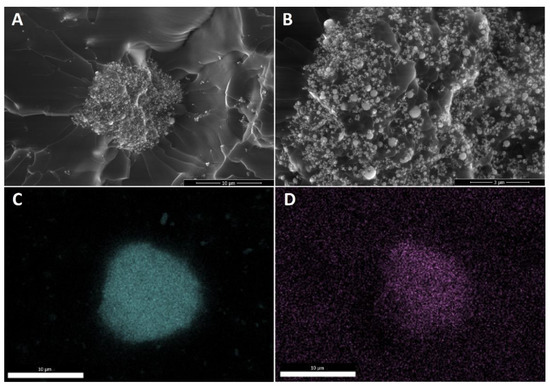 Microdroplets of condensed SS-6GP-2TMOS together with TiO2 particles visible for 1Ti15SS-6GP-2TMOS. (A)—10,000× magnification; (B)—30,000× magnification; (C)—titanium (Ti) EDS; (D)—silicon (Si) EDS.