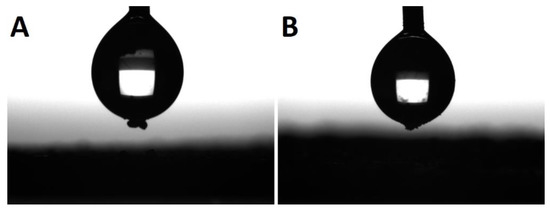 Water droplets during sessile drop analysis. Particles of modified TiO2 visible on the bottom of each droplet after an attempt at placing the droplet on the pigment surface. (A)—TiO2-1.5% iBuTMOS; (B)—TiO2-1.5% iBu7SSQ-OEt.