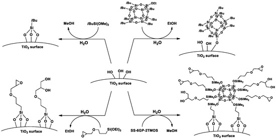 A proposed mechanism of TiO2 surface silanization with iBu7SSQ-OEt, SS-6GP-2TMOS and silane coupling agents.