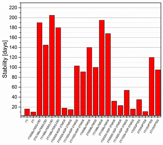 The stability of modified and pristine TiO2/liquid epoxy resin suspensions was assessed by pouring samples of the suspensions in screw-capped centrifuge vials and leaving them on standing. Then, they were checked every couple of days for any signs of phase separation, including pigment precipitation on the vial walls or bottom, resin cloudiness, or discoloration near the surface. The samples prepared by mechanical stirring all underwent heavy phase separation within two weeks from preparation, as the larger agglomerates of TiO2 were characterized by poor stability in the suspension. It correlates with the SEM images (Supplementary Information), as these larger agglomerates were captured. On the other hand, the samples prepared by high shear pump mixing showed much higher suspension stability, the improved dispersing method increasing the stability time by over an order of magnitude for some of the studied systems (Figure 10). The main conclusion obvious from the results obtained is that, independently of the discussed TiO2 system used, increasing pigment loading from 1% to 2% resulted in more or less severe reduction in the suspension stability. It can be understood as higher concentration of TiO2 particles in the epoxy suspension causing their faster aggregation over storage time; however, the SEM images of TiO2/EP composites made from freshly prepared suspensions also revealed increased agglomeration in the composites containing 2% of TiO2. These results suggest that for the TiO2 pigments of limited stability, formation of primary agglomerates (<10 μm) is a fast process, after which these agglomerates grow at the rate depending on the pigment concentration in the suspension and the surface physicochemistry of the particles, up to the point of spontaneous sedimentation. This idea is further supported by the results of hiding power study (Figure 11). Interestingly, some of the studied coupling agents provided virtually no stabilization to the pigment over prolonged time, that is, SS-6GP-2TMOS at 0.5% loading and SS-5GP-3TMOS at both loadings. It may be due to the protic character of the diol groups generated during surface coupling of TiO2, resulting in interparticle attraction, but also less effective particle coating with the coupling agent and the gelling thereof, as discussed earlier (Section 3.2. Surface Properties of the Obtained Modified TiO2 Pigments). GPTES showed behaviour comparable to that of SS-6GP-2TMOS. On the other hand, iBu7SSQ-OEt at 0.5% loading provided stabilization superior to all the other coupling agents studied, and at 1.5% loading, slightly higher than that of iBuTMOS. It is due to the apolar character of the isobutyl group, which both the SSQ and silane compounds share in common.