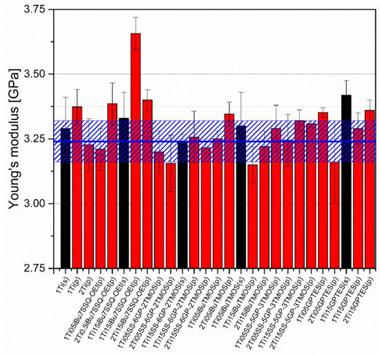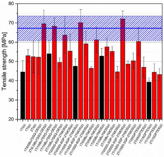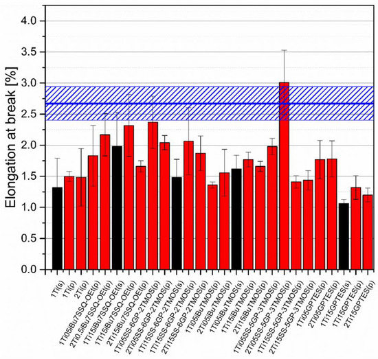 Mechanical analysis revealed subtle differences between the TiO2/epoxy systems studied, even despite low loading of TiO2 in the composites (Figure 13, Figure 14, Figure 15 and Figure 16). For Young’s modulus, it was observed that the systems present stiffness comparable to the neat epoxy within the limits of the standard deviation (Figure 14). Also, for the samples containing either 1% or 2% of the same type of prepared TiO2 (either pristine or modified), there was a tendency towards Young’s modulus increase along with the pigment concentration for well-dispersed systems (e.g., 0.5% iBu7SSQ-OEt/TiO2, 0.5% iBuTMOS/TiO2), while for the agglomerating pigments, the value would drop (e.g., pristine TiO2, 0.5% GPTES/TiO2). Due to low loadings of the pigmenting filler used, retention of tensile properties (tensile strength and elongation at break, that is) should rather be considered instead of their improvement, as the loading of the filler is too small to provide enough reinforcement and the mechanical failure may propagate throughout the bulk polymer. For tensile strength, mechanical stirrer-prepared composites were the weakest from each series, as the agglomerated particles provided spots of structural imperfection, causing material failure. Some of the highest values of tensile strength and elongation at break were recorded for systems loaded with TiO2 modified with 1.5% of SS-6GP-2TMOS and 0.5% of SS-5GP-3TMOS due to high dispersion and well-developed particle-polymer interphase. Also, iBu7SSQ-OEt/TiO2, performed slightly better than its silane counterpart system, iBuTMOS/TiO2, suggesting that silsesquioxane- and spherosilicate-based coupling agents provide better surface treatment agents, likely due to less gelation side reactions.