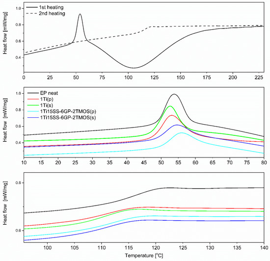 DSC plots of selected epoxy systems; neat EP (top); Tgu region (middle), Tg region (bottom).