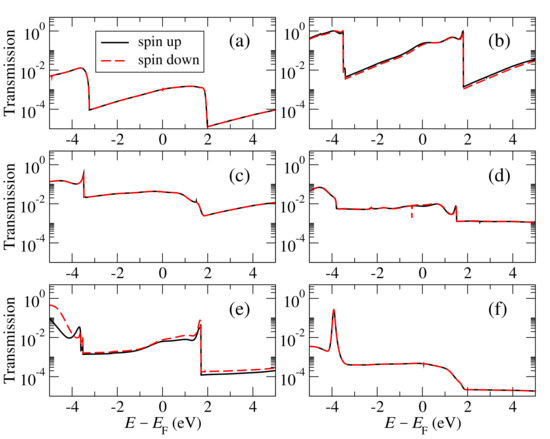 Once the electronic and magnetic properties are calculated, we simulate the electronic transport. Notice first that the bulk states, whose local density of states (LDOS) integrated around the Fermi level is shown in Figure 1, reach the carbon atoms at edges, which implies their coupling across the gap is going to be larger than for zigzag edges, which do not couple to the edge states [16,17]. We first determine the zero-bias transmission at a distance between the edges (size of the nanogap) of 3 Å. A compilation of the results is shown in Figure 2, where we plot the transmission across graphene nanogaps passivated with hydrogen, which is the most typical case, and the other atoms from the second row of the periodic table (B, C, N, O, and F). Notice that, as one moves from B to F, two trends can be observed: First, the transmission at the Fermi level (conductance) steadily decreases and, second, its positive slope is also reduced. This evolution can be easily explained by taking into account two effects: On the one hand, as one moves towards the right of the periodic table the effective size of the atom decreases due to the increase of the nuclear attraction, which reduces the overlap across the gap; on the other hand, the on-site energies move to lower energies for the same reason as before, which reduces the slope of the transmission. The change in the slope can be properly simulated with the tight-binding model [17] and easily explained by taking into account that the maximum of the transmission is at the energy of the on-site state, which is initially above the Fermi level; as this moves to lower energies the maximum moves as well, decreasing the value of the slope and eventually changing its sign.