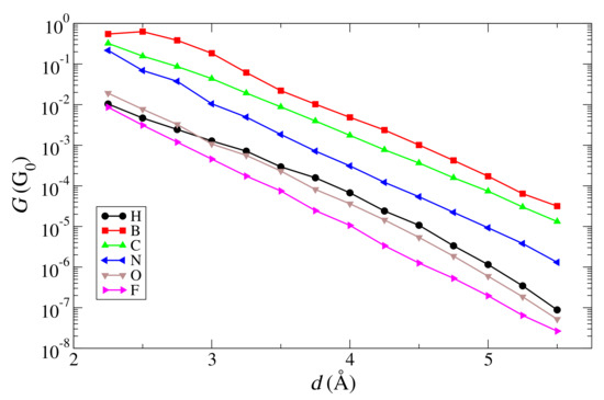 The exponential decay of the conductance, obtained by calculating the transmission at the Fermi level as a function of the distance between the edge atoms on both sides of the gap, can be seen in Figure 3. A clear exponential behavior can be observed in most cases, which is typical of the tunneling regime. The factors, obtained by fitting the curves, are shown in Table 1. Note that these are approximate values, since some of the curves deviate from a pure exponential behavior at the beginning or at the end (e.g., the H and B curves; the other cases fit rather well to an exponential). From these results, it can be deduced that the closer the atom to the right of the periodic table, the higher the , which, again, is an expected result due to the weakening of the coupling and the movement of the on-site energies to lower values, which translates into a higher tunneling barrier.