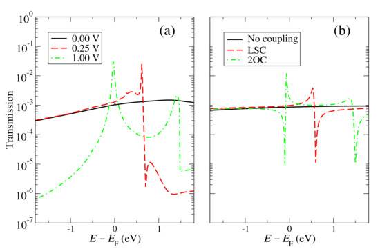 Other features that appear at higher voltages in the ab-initio simulation and which come also from interference (various peaks and/or dips) can also be explained by taking into account couplings across the gap of the impurity sites (what we call second-order coupling, 2OC) [17]. For instance, if a coupling is introduced between the impurity in one side and the second “carbon” atom on the other side, , this gives a dip, two peaks, and another dip, a multiple path features shown also in Figure 5b (green dot-dashed curve). This feature, as well as the LSC one, move towards the Fermi level as the bias increases and also change their shape due to the shift of the on-site energies, a behavior that is also captured by the tight-binding model. These two cases (LSC and 2OC) essentially characterize all features that might appear in the transmission as the voltage increases. Notice, however, that such cases represent a qualitative characterization of the essential features that appear in a more complex system (which has different on-site orbitals and couplings between them at different energies and distances) and serve to isolate such features and explain their origin (the particular coupling that becomes more relevant for a given energy and voltage.)