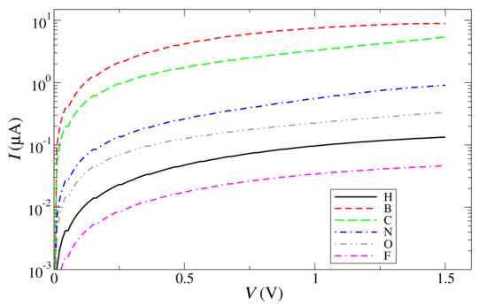 All ohmic currents calculated with two unit cells along y are compared in Figure 6, where it is clear, just like for the transmissions and conductances, that the current decreases as one moves towards the right of the periodic table. These ohmic currents can be used, first, to prove that the edges are straight and do not have prominent features, and, second, to distinguish the type of impurity that is attached to the edges. By carefully measuring then the current in present experiments and mapping such a current to atmospheres with certain types of impurities, it should be possible to establish a clear relation between both of them.