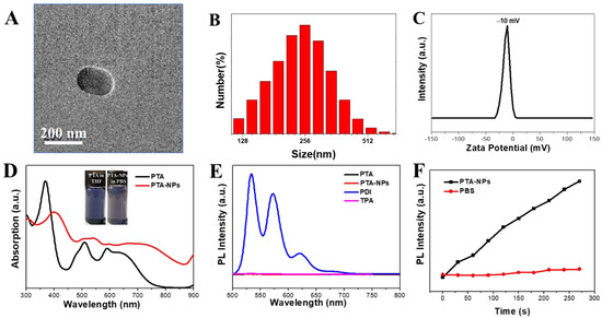 (A) TEM image of PTA-NPs; (B) DLS size profiles of PTA-NPs; (C) zeta potential of PTA-NPs; (D) UV/Vis absorption spectra of PTA and PTA-NPs (insert: the photographs of PTA in THF and PTA-NPs in PBS); (E) fluorescence spectra of PTA, PDI, TPA, and PTA-NPs; (F) changes in photoluminescence (PL) intensity of the characteristic peak of DCF (525 nm) with irradiation time.
