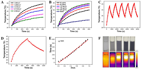 (A) Photothermal curves of PTA-NPs (45 μg/mL) under irradiation of 635 nm laser at different power densities; (B) photothermal curves of PTA-NPs at different concentration under 635 nm laser irradiation (1.25 W/cm2); (C) photothermal stability of PTA-NPs (45 μg/mL) during five on/off cycles of laser (1.25 W/cm2); (D) photothermal effect of PTA-NPs in water under irradiation of 635 nm laser (1.25 W/cm2) for 10 min, followed by the cooling for 10 min; (E) negative logarithmic relationship between cooling time and temperature; (F) photothermal images of different concentrations of PTA-NPs under 635 nm laser (1.25 W/cm2) irradiation (top: images of PTA-NP solution under natural light; bottom: thermal images after 635 nm laser irradiation for 10 min).