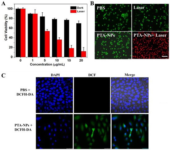 (A) Concentration dependence of the cytotoxicity of PTA-NPs against A549 cells; (B) fluorescence images of calcein AM (green fluorescence; live cells) and PI (red fluorescence; dead cells) co-stained A549 cells after treated with PBS only, laser irradiation only, PTA-NPs only, or PTA-NPs + laser irradiation (scale bar = 25 μm); (C) the intracellular ROS generation of PTA-NPs using DCFH-DA as a fluorescent probe (scale bar = 25 μm).