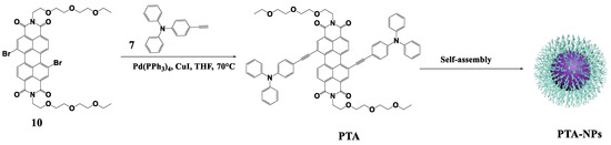The synthetic procedures of PTA molecule and PTA-NPs are shown in Scheme 1 and Scheme S1 (see Supplementary Materials). PTA with a D-A-D structure was synthesized through a Sonigashira coupling reaction with electron donor TPA and perylene diimide as the starting materials. The amphiphilic organic molecule was then self-assembled into the nanoparticles (PTA-NPs) by the reprecipitation method. The structure of the target molecule was confirmed by mass and NMR spectra (see Supplementary Materials Figures S1–S6).