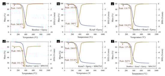 | (f) Laminate 6: Bamboo + Kenaf + Epoxy + MWCNT | 3363, 2924, 2857, 1641 (broad), 1591, 1505, 1467, 1242, 1180, 1018, 827, 822, 698. | Epoxy ring peak—915 cm−1 vanished |