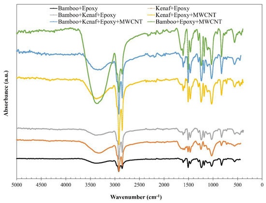 | (e) Laminate 5: Kenaf + Epoxy + MWCNT | 3363, 2924, 2857, 1641 (broad), 1591, 1505, 1467, 1242, 1180, 1018, 827, 822, 698. | Epoxy ring peak—915 cm−1 vanished |