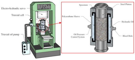 The uniaxial and triaxial compression tests were conducted on an RMT-301 test system that can realize the axisymmetric triaxial experiments. The RMT-301 test system was developed by CAS Wuhan Institute of Rock and Soil Mechanics. The vertical hydraulic cylinder was equipped with two different range force sensors and displacement sensors. Figure 1 shows the loading device for uniaxial and triaxial compression tests.