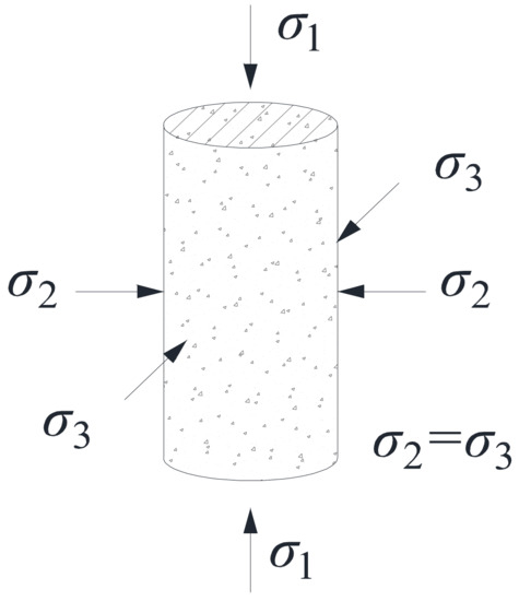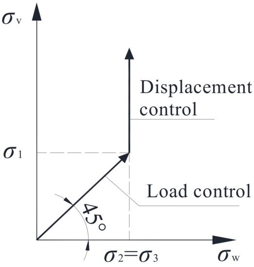 Figure 4 shows the triaxial compression test loading mode with the mixed control of load and displacement. First, load control was used, then displacement control was used. In the load control stage, when the preset confining pressure σ2 = σ3 was applied, the axial stress σ1 was applied at constant speed until the specimen was in the triaxial hydrostatic stress state (i.e., σ1 = σ2 = σ3). At this moment, the confining pressure was kept constant, and the vertical load adopted displacement control with the loading rate of 0.01 mm/s until the specimen failed. The uniaxial compression test adopted displacement control of the loading system, and the axial loading rate was 0.01 mm/s.