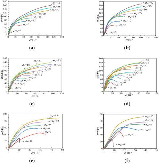 From Figure 6, it can be inferred that the shape of stress-strain curves is greatly influenced by the lateral confining pressure. The relationship between stress and strain is almost linear at a lower axial stress state, but nonlinear at a high-stress state. The descending branch of the triaxial compression stress-strain curves becomes smoother (i.e., higher ductility), and when the confining stress reaches 15 MPa (σ3 = σ2 = 15 MPa), the stress-strain curve continues to rise. The low-strength concrete specimens have greater compressive deformation capacity under triaxial stress, and the aggregate immersion time has little effect on the stress-strain curves of specimens.