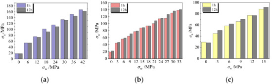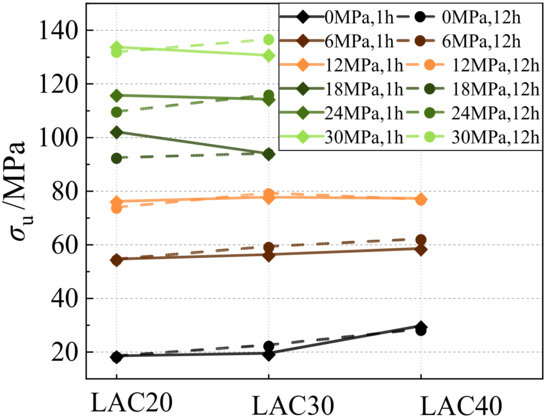 Figure 9 shows the variation of peak stress with confining pressure for LAC with an aggregate immersion time of 1 h and 12 h. According to Figure 9a, when the lateral confining pressure σw ≤ 6 MPa, the peak stress of LAC (LAC20) was hardly affected by the immersion time of the aggregate. However, when the lateral confining pressure was greater than 6 MPa, the peak stress of LAC in which the aggregate had been soaked for 12 h was about 5% smaller on average than that in which the aggregate was soaked for 1 h. As seen in Figure 9b–c, for LAC with design strengths of 30 MPa and 40 MPa, the peak stress of fly ash ceramsite aggregate soaked for 12 h was greater than that soaked for 1 h, which constitute an increase of approximately 5.0% and 3.7%, respectively.