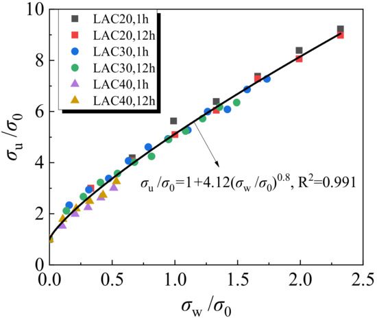 where ζ and Φ are fitting constants. Through fitting analysis, ζ and Φ of LAC are 3.13 and 0.8, respectively. The comparison of Equation (7) with the test data for LAC is shown in Figure 15.