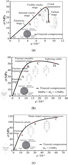 Failure process of specimens. (a) Failure process of stress-strain curve under uniaxial compression. (b) Failure process of stress-strain curve under triaxial compression (0 MPa < σw ≤ 12 MPa). (c) Failure process of stress-strain curve under triaxial compression (σw > 12 MPa).