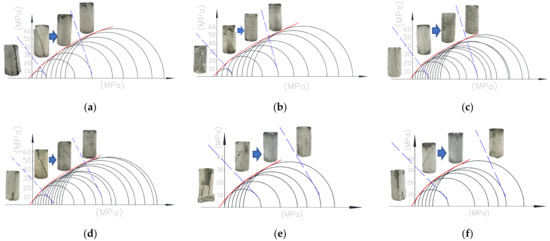 Mohr–Coulomb stress envelope for LAC. (a) LAC20, soak for 1 h; (b) LAC20, soak for 12 h; (c) LAC30, soak for 1 h; (d) LAC30, soak for 12 h; (e) LAC40, soak for 1 h; (f) LAC40, soak for 12 h.