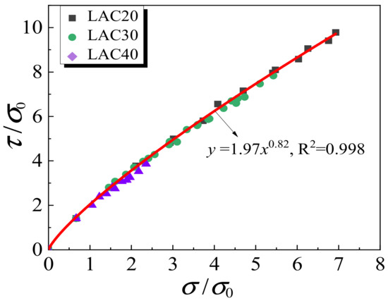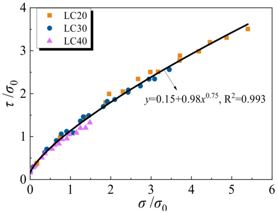 The test data were input into Equations (4) and (5) and normalized with σ0 (the uniaxial compressive strength). The normalized shear stress failure model obtained through the fitting analysis is as follows: