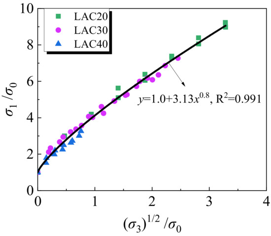 Under the conventional triaxial condition (σ1 > σ2 = σ3), the measured results were drawn as the triaxial compression failure surface of LAC. This is a plane with a principal stress axis and a diagonal in space, also called the Rendulic plane or the pressure meridian plane. The measured results are summarized, and σu and σ3 are dimensionless parameters; the relation equation of σu and σ3 can be written as follows: