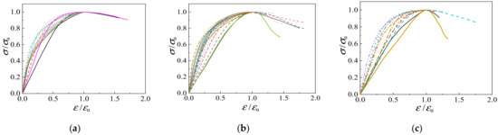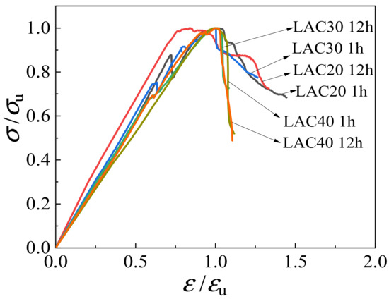 Figure 16 depicts the relationships between axial stress σ/σu and strain ε/εu of LAC. The figure shows that the ascending branch of the curve is obviously affected by the intensity grade. There is a big difference in the downward part of the curve, which shows that the higher the strength grade and the longer the soaking time of the aggregate, the steeper the drop in the curve.