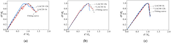 where x = ε/εu, y = σ/σu, and k and q are the fitting coefficients. According to the data fitting analysis, the coefficients k and q of LAC20 were 1.32 and 4.82, respectively; the coefficients k and q of LAC30 were 1.20 and 8.28, respectively; and the coefficients k and q of LAC40 were 1.11 and 70.67, respectively. The comparison between the fitting results and the curve under different parameters is shown in Figure 17. The proposed stress-strain equation can match the experimental results of LAC well.