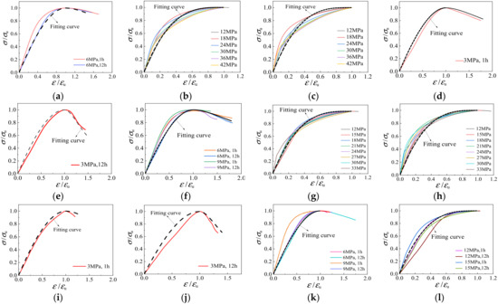 Comparison of test curve and fitting curve under different parameters. (a) LAC20, 0 MPa < σw ≤ 6 MPa; (b) LAC20, soak for 1 h, σw > 6 MPa; (c) LAC20, soak for 12 h, σw > 6 MPa; (d) LAC30, soak for 1 h, σw ≤ 3 MPa; (e) LAC30, soak for 12 h, σw ≤ 3 MPa; (f) LAC30, 3 MPa < σw ≤ 9 MPa; (g) LAC30, soak for 1 h, σw > 9 MPa; (h) LAC30, soak for 12 h, σw > 9 MPa; (i) LAC40, soak for 1 h, σw ≤ 3 MPa; (j) LAC40, soak for 12 h, σw ≤ 3 MPa; (k) LAC40, 3 MPa < σw ≤ 9 MP; (l) LAC40, σw > 9 MP.